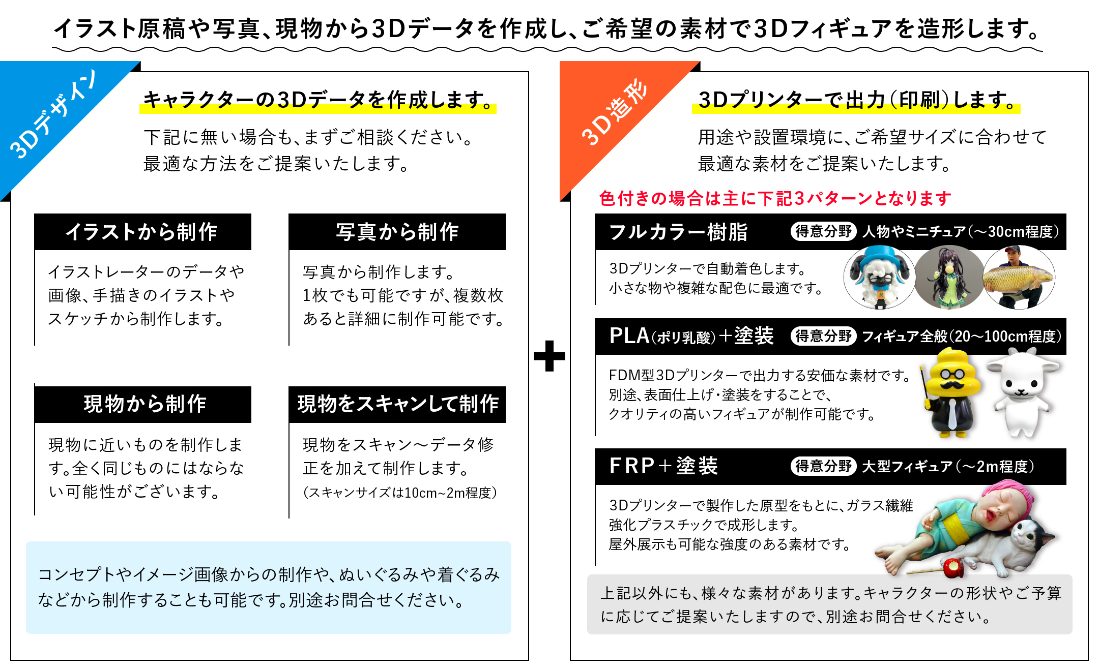 なお、等身大フィギュアや1.5m以上の大型造形物については、別途、下記専門サービスもご覧ください。