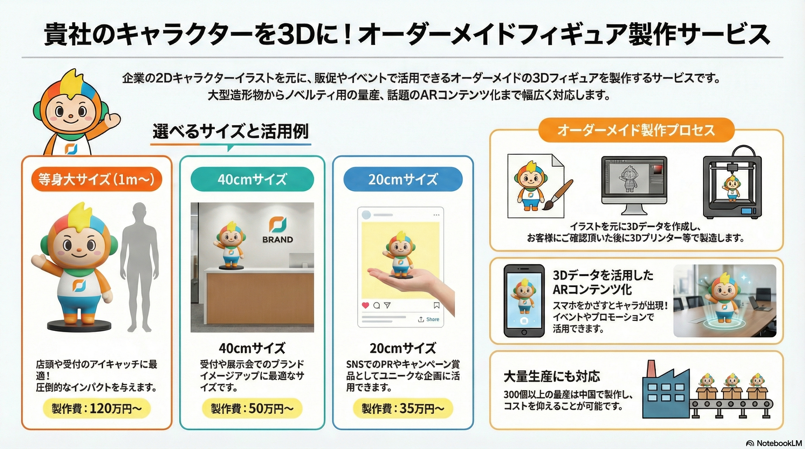 企業のオリジナルキャラクターを立体物にしませんか?大型フィギュア・人形の作成や、販促に使えるノベルティ、記念品等の製作を承ります。話題のVR・AR化も対応可能です。