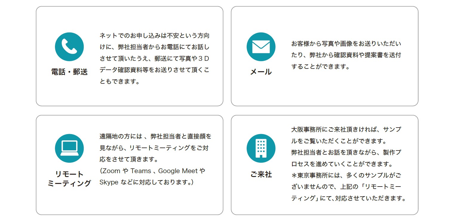 弊社の3Dデザイナーが3Dモデルデータを作成し、3Dプリンターで出力します。お客様のご要望を細かくヒアリングし、3Dデータをご確認頂きながら進めていきますのでご安心ください。ZoomやTeams、Google meet、Skype、Cisco Webex等テレビ会議での打ち合わせもOKです。