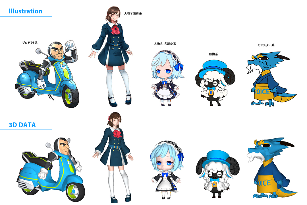 もちろんイラストから3D データを作れます。 写真からも3Dデータを作れます。ぬいぐるみや着ぐるみ等の現物を3Dスキャンして3Dデータも作れます。コンセプトからも3Dデータを作れます。 2 次元図面からも3Dデータを作れます。どのような3Dデータを作りたいか、形状や用途によって最適な3D データ制作方法をご提案いたします。